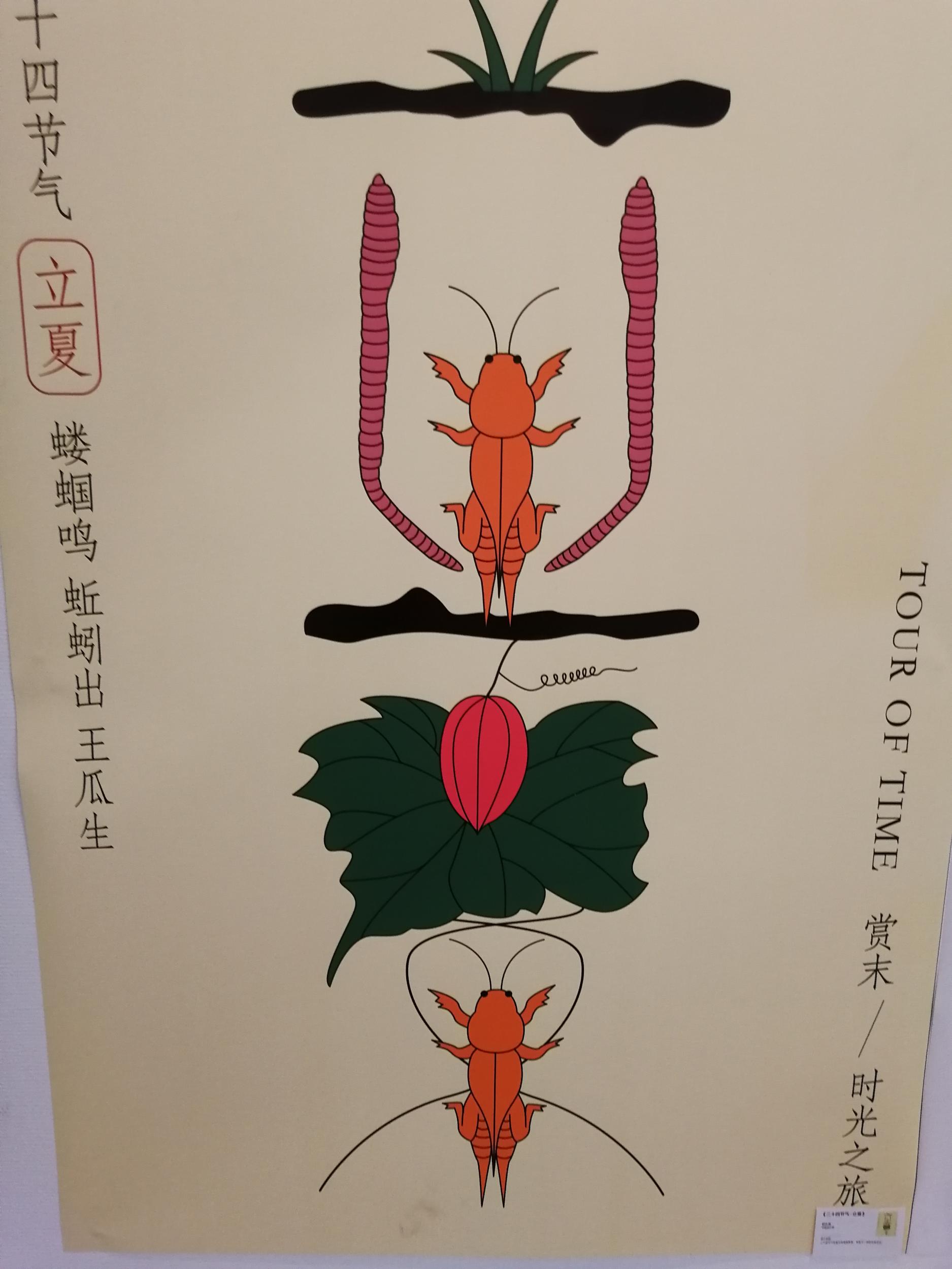 虽然二十四节气已经是世界级非物质文化遗产,但对于这些节气的含义,很多人并不清楚。立夏意味着夏天的开始,万物至此皆长大,故而蝼蝈鸣,蚯蚓出,王瓜生。这幅《立夏》巧妙地在“立夏”二字的笔画中运用蝼蝈、蚯蚓、王瓜的形象,让观众“秒懂”这一节气的特点。