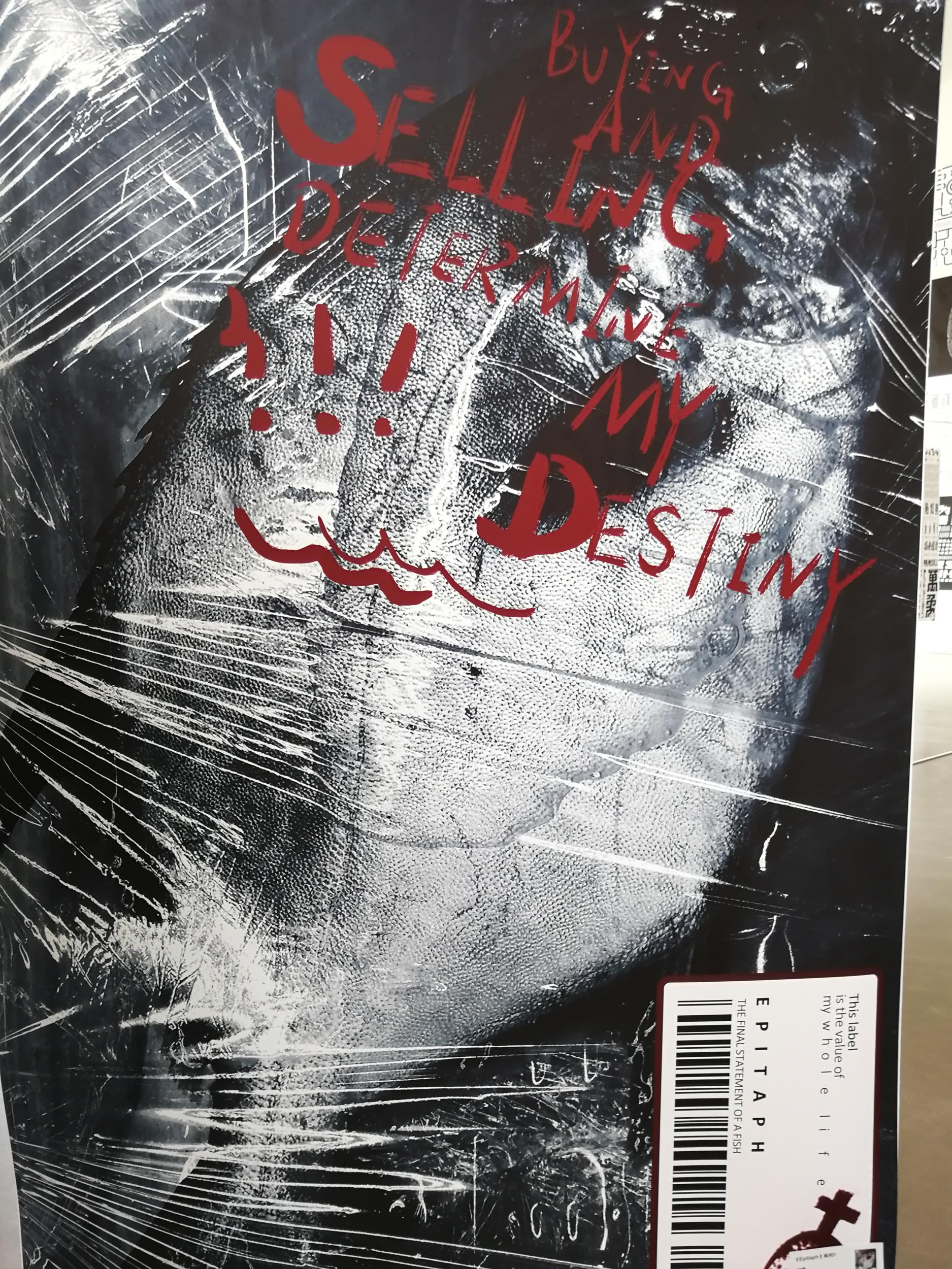 抱慰生命、表达对世界和人生的反思,是艺术的使命。这幅EPITATH展示的其实是一件在超市售卖的生鲜商品,在表面覆着的保鲜膜上,设计师用触目惊心的红色字体,为这条生命写下墓志铭:Buying and selling determine my destiny.(我的命运就是被买卖)这句话是一条鱼最后留给世界最后的话语。