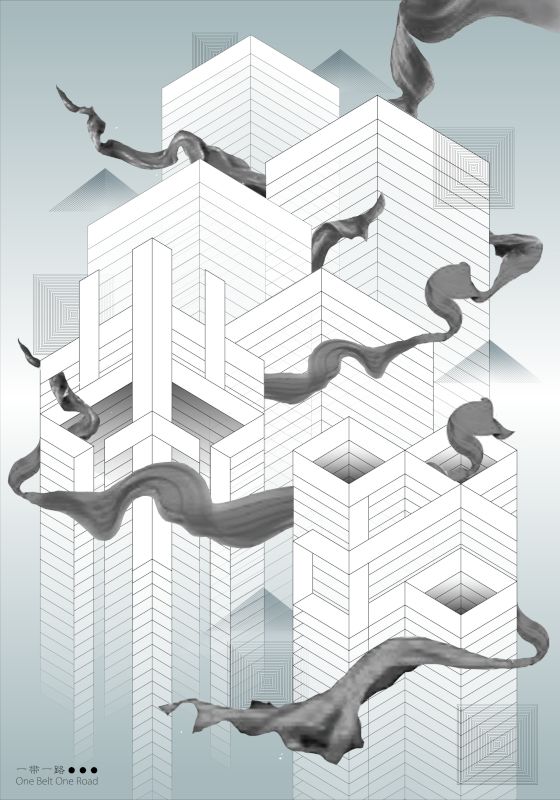 在这幅作品中,如果说林立的高楼象征着现代化的中国,那么飞舞其间的丝绸则令人想起那条运输着丝绸、茶叶并促进了中西方文化交流的古丝绸之路,从整体的视觉呈现来说,沙漠又构成了画面的重要因素之一。作品似乎意在表明,孕育了古丝绸之路的中国将以更加繁盛、强大的姿态参与到和谐包容的全球化世界的构建中来。