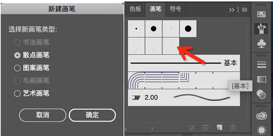4、然后我们将制作好的渐变线条直接拖进画笔面板即可定义新画笔(菜单—窗口—画笔),画笔类型选择散点画笔。