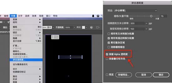 3、选择:对象-合并不透明度,并且要保留Alpha透明度,使我们在后期制作效果中偏向失量化,这样才能自由缩放不会失真。