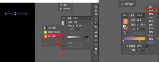2、画好想要的线条后,将线条描边换成调好的渐变色,并调节不透明度。