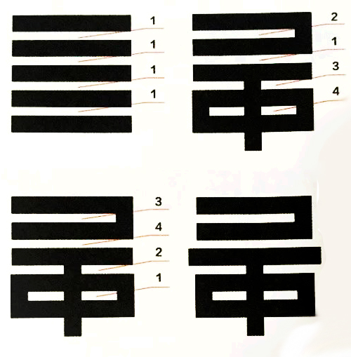 图中有5条间隙相等的横线,当添加了4根竖线后就会发觉,贯通的间隙感觉白最大(1),半封闭的次之(2),中间截断的第三(3),全封闭的感觉最小(4),只要调整间隙使全封闭的为最大(1),中间截断的次之(2),半封闭的为第三(3),贯通的最小(4),白在视觉上就均匀了。如果把它当作一个字体来设计,就要考虑部件的个性、大小和参差关系,该宽的宽,该窄的窄。