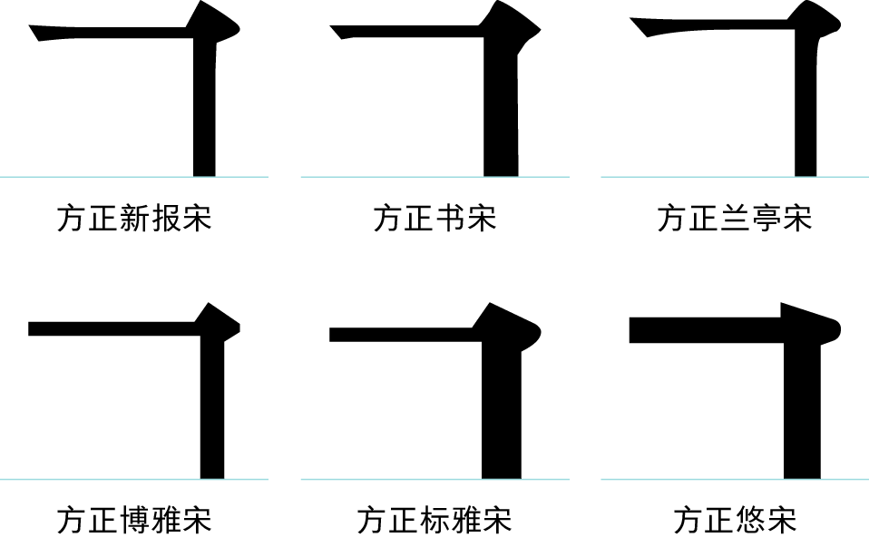 ▲六种宋体的折笔处笔形对比