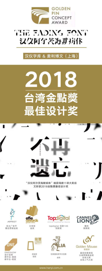 2018年11月29日,设计圈年度盛事金点设计奖颁奖典礼在台北松山文创园区多功能展演厅盛大举行,象征最高荣誉的“年度最佳设计奖”揭晓!汉仪字库凭借作品《汉仪阿尔茨海默病体》获得最佳设计奖殊荣。