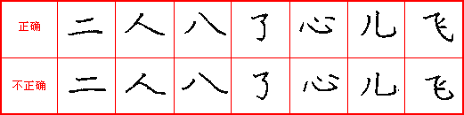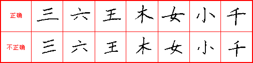 准,就是每写一个笔画之前要看准下笔的位置,这主要指在临摹字帖过程中,一要看准字帖上字的笔画在格子中间的位置;二要看准笔画的形态,同一种笔画在不同字的结构当中或在同一个字的不同部位有长、短、横势、竖势、斜势等不同的表现形态,应看准、写准;三要看准笔画的粗细,是重下笔还是轻下笔,收笔是顿笔还是出尖,要看准、写准。做到位置准确、长短适宜、租细恰当。见下图