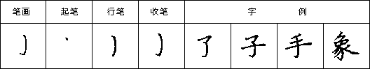 (三)撇 撇画在一个字中很有装饰性,如能写得自然舒展,会增加字的美感,有时还与按画相对称起着平衡和稳定重心的作用。撇有斜撇、竖撇、短撇之分。斜撇的写法是,下笔稍重,由重到轻向左下行笔,收笔时出尖。如图: