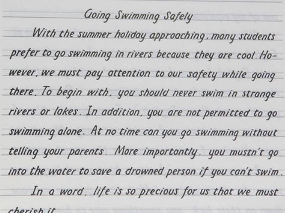 考场或者自习(当然搞不好还会被请去英语组办公室当面写)工具:直尺,铅笔(以H型号最佳),橡皮,0.9mm中性碳素笔(这个是重点,平时用的0.7以及以下请弃用),任意横格纸或考试答题卡(不推荐四线三格自动生成的英语练习本)。具体操作:第一步:取出支持,在横线上四五mm处用铅笔轻轻描出一直线(具体高度以个人实际为要,但拒绝小字)。然后重复操作至最后一行。第二步:结束笔尺作图,取出0.9mm中性碳素笔,首行空两字母开始写起具体要求:①圆滑。单个字母要求字迹圆滑,不得出现刚直的点(这个不晓得怎么去表述)。②间距。字母与字母间间距要求清晰可见,单词与单词之间要求一个字母的间距③大小。字母发现要求顶格写满。比如acemno这些一个格内的字母,必须写满横线与手画线,bd要求上不出底线,pq要求不出上线。f的横必须出现在手画线上或者附近。④其他。整体要求不能出现花体连笔,完成之后静待30秒左右以便油墨自行风干,取出橡皮擦,从上至下依次擦除手画线。最后,抖落橡皮屑,大功告成。