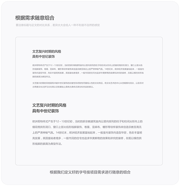 当我们定义好字号,标题和正文就可以根据实际项目需求进行自由搭配了。在给标题和正文选择字号时要注意它们之间的对比关系,字号差异越大它们的层级关系就越明显,但它们之间的差异又不能太大,差异过大会影响整体的视觉平衡性,给人一种不和谐不自然的感觉。