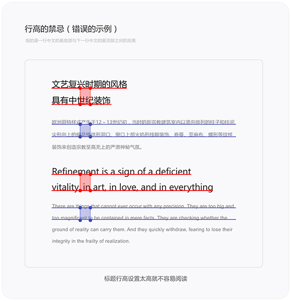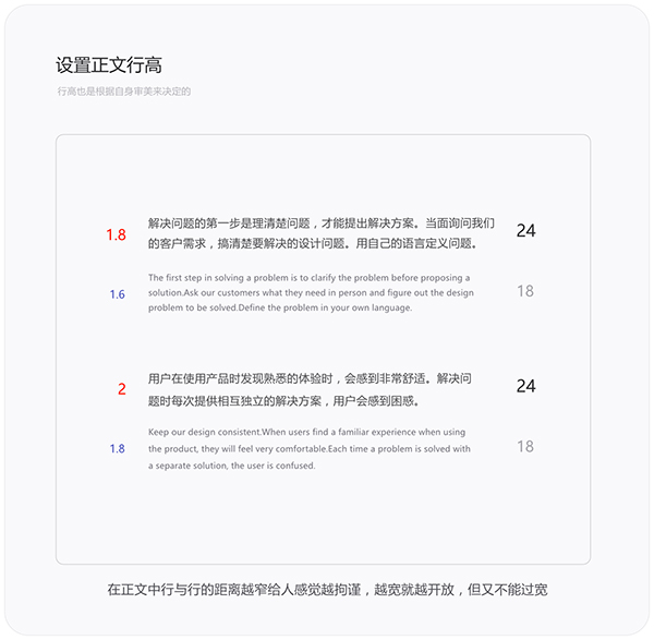 不管是标题、正文还是注释,他们的行高都不宜过高,行高过高会导致内容不易阅读,文字之间的整体性也会被打散。标题的字号越大行高应该越小,正文的字号越小行高应该越大。当然这些规则都是相对的,行高大小要合理把控,不能太大或过小。那要如何合理设置行高呢,往下看。