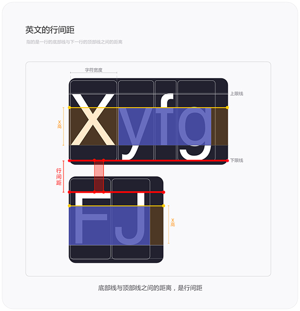英文的行间距就没有行高那么复杂,也不用画基线。英文的行间距跟中文相同,指的是一行英文的底部线与下一行英文的顶部线之间的距离。其实也可以简单的理解为“行与行之间的距离”并称之为行间距。另外英文底部和顶部都有对应的专有名词的,在英文字体结构中最顶部/最底部隐性的两条线称为“上沿线/上限线”和“下沿线/下限线”。这块的知识先了解一下就行,以后在字体结构中会讲到。