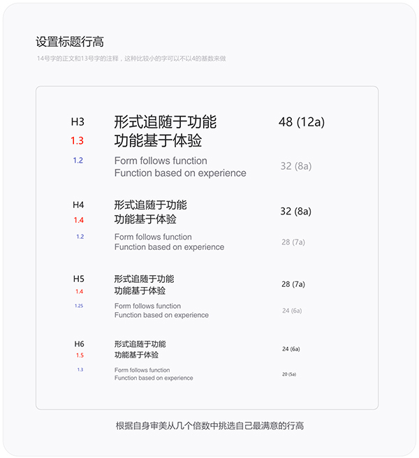 从测试结果中找到自己满意的行高就可以了。字号x倍数=行高,这里也不怕倍数小数位太多的问题。在绘图软件中是以像素为单位,但有时候前端代码会用父继承单位“em”。例如:大标题H3的字号是48px,行高是62.4px(48x1.3倍),62.4px=1.2816667em,那转换为前端代码就是h3.test{line-height: 1.3em},直接做约等于就行了,差一点点看不出来的。