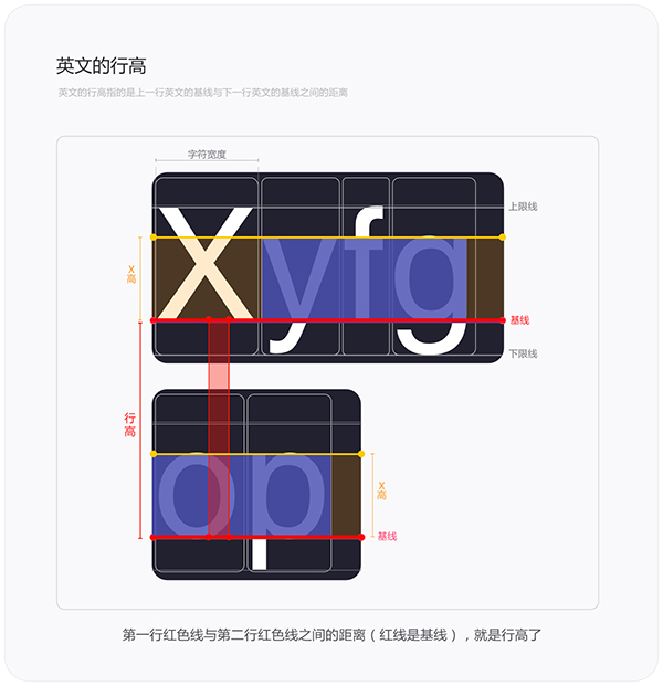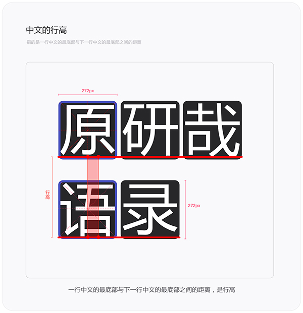 接下来理解下中文的行高。上面讲到说英文的行高是由基线决定的,但中文字体与英文字体结构不一样,中文里没有基线的概念,那该怎么定义行高呢。中文的结构属于方块字没有基线,所以中文的行高指的是一行中文的最底部与下一行中文最底部之间的距离。中文字体结构中没有上沿线/上限线和下沿线/下限线的概念,它们只存在于英文字体结构中。