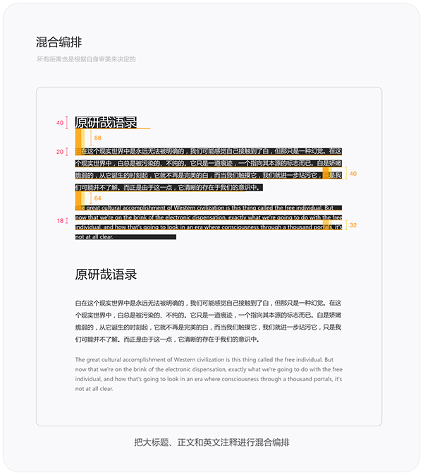 好的,完全理解上述所有知识就可以把标题、正文和注释进行混合编排了。大标题字号40px、正文字号20px、正文行高40px、注释字号18px、注释行高32px、标题与正文的间距88px、正文与注释的间距64px。