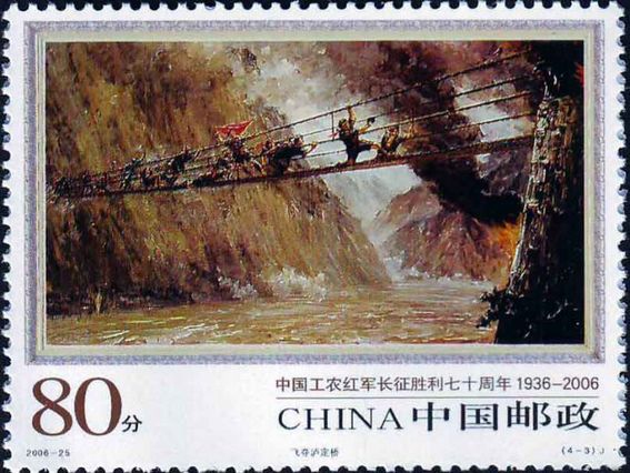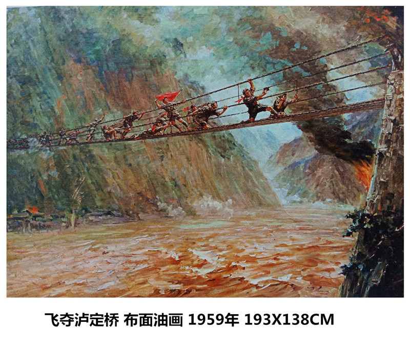 刘:我到泸定去体验过生活,住了十多天。画里的环境啊,桥啊,桥墩啊,江水啊,后面的远山,都是照着写生画的。到了那个地方,慢慢身临其境,思想感情沉下来,体会当时是什么情景,一天一天慢慢深入下去,慢慢进入角色,就像演戏一样的进入角色。画创作就像你一个人又在编剧,又在导演,又在调动演员,这样子画出来,算是完成任务。早先有人画过这题材,叫《抢夺泸定桥》。作者没有到四川体验生活,完全凭一种想象画的,不太容易深入,就不具体。最后又重新安排画。