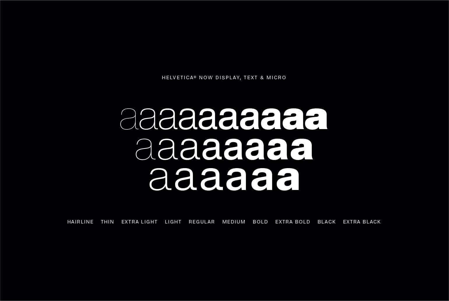 Micro版本是Helvetica Now的一个突出特点,它解决了Helvetica长期面临的一个问题 - 即微型挑战。虽然Neue Helvetica在微小尺寸上挣扎 - 例如在平板电脑和智能手表上 - Helvetica Now的微型设计被简化和夸大。它们保留了小尺寸Helvetica的印象,并且它们的间距是松散的,这意味着在微观尺寸和低分辨率环境中保持易读性。