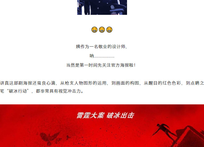 讲真这部剧海报还蛮良心滴,从*支人物图形的运用,到画面的构图,从醒目的红色色彩,到点睛之笔“破冰行动”,都非常具有视觉冲击力。