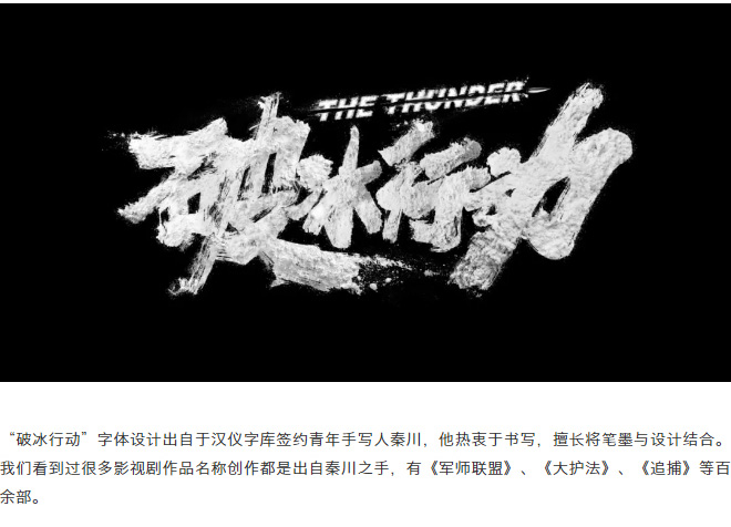 “破冰行动”字体设计出自于汉仪字库签约青年手写人秦川,他热衷于书写,擅长将笔墨与设计结合。我们看到过很多影视剧作品名称创作都是出自秦川之手,有《军师联盟》、《大护法》、《追捕》等百余部。