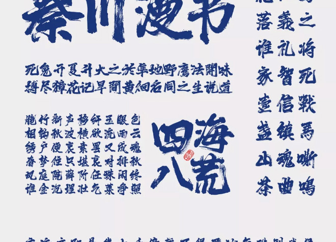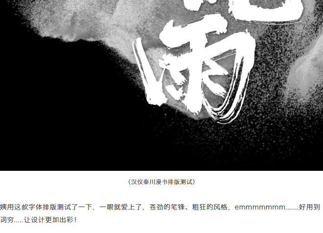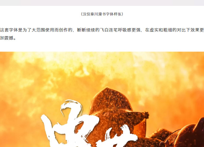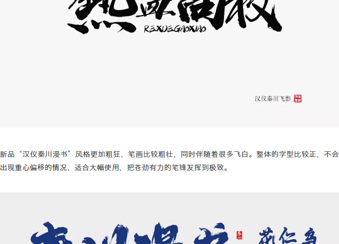 新品“汉仪秦川漫书”风格更加粗狂,笔画比较粗壮,同时伴随着很多飞白。整体的字型比较正,不会出现重心偏移的情况,适合大幅使用,把苍劲有力的笔锋发挥到极致。