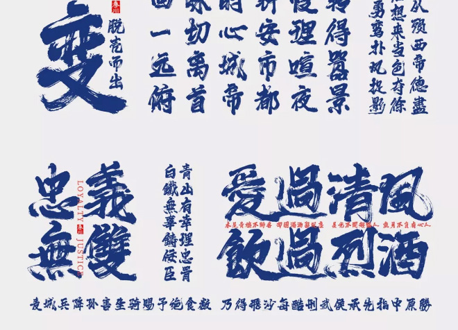 这套字体是为了大范围使用而创作的,断断续续的飞白连笔呼吸感更强,在虚实和粗细的对比下效果更加震撼。