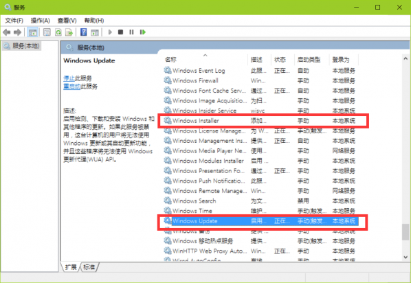 3.在打开的服务中,找到windows update和windows installer,查看启动状态,如果么有启动,就将其启动即可。