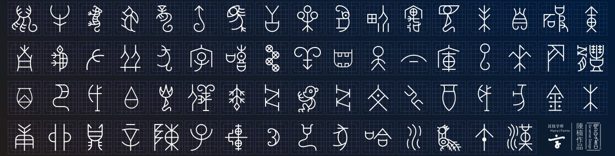 “汉仪陈体甲骨文”是国内外第一套甲骨文设计字库。由汉仪字库与清华大学陈楠老师合作开发完成。这款字库揭示了甲骨文所蕴含的数学之美与网格秘密,开启了一条全新的字库设计路径,第一次推出了不以书写作为主要功能的字库设计先例,将设计开发的重点放在图案表意以及文化衍生之上,在商业开发的同时担负起文化承传的社会责任。
