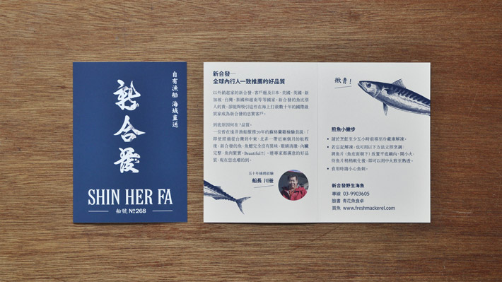 想把吃到盘底朝天的滋味分享给朋友们的心情,是这品牌创始的原点。「新合发」一个电子商务平台,极鲜管理產地到餐桌渠道,专售新鲜冷冻鯖鱼;品牌命名建议取源自家的渔船船号「新合发」,「合发」是40多年的家族精神,三代坚持没敢忘记,影像实际取材自船身上的歷史图案,再加以视觉处理,古拙质朴的书法风格Logo标誌,传递新鲜的品牌与食材记忆,同时期许经营者莫忘家族歷史与坚持的原始初衷。