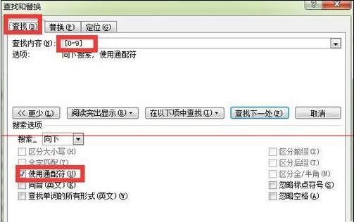 步骤3:进入查找的页面后,在“查找内容”一栏输入【0-9】,意思是需要查找所有的数字,然后勾选下面“使用通配符”的选项。