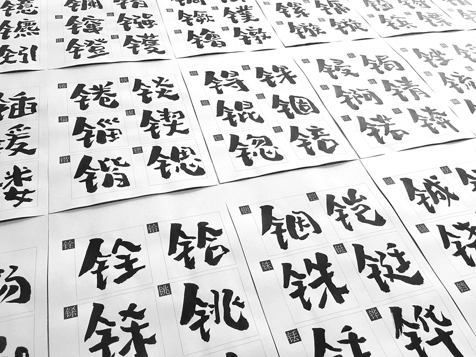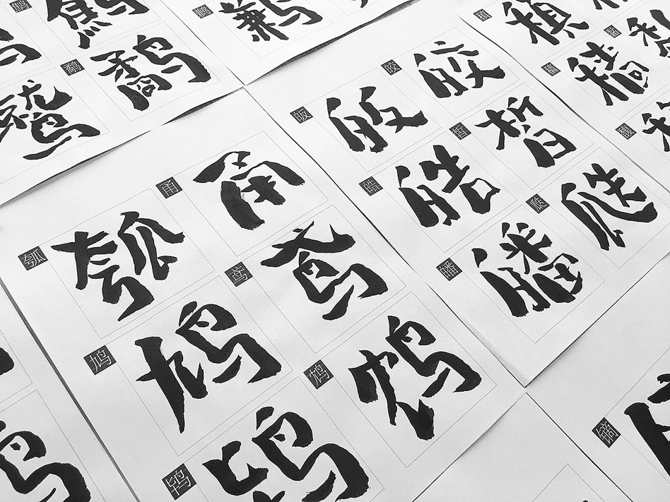 2018年初与站酷第一次合作开发书写第一款个人手写毛笔书法字体,在开始构思字库的字形前,经过大量的书写尝试,并对比了其它平台的线上字库字形,最后决定尝试书写一款区别于传统字库书法的字体,并命名为《站酷妙典和风体》。全字库简繁体+日文+符号共计9913个字符。字库前后耗时半年有余,后期修改与文件制作耗时三月,终于在今天和大家见面了。