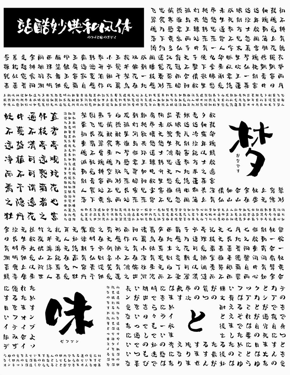 站酷妙典和风体,定义为国内首款个人和风手写字形,在基于传统书法字形结构基础上,用区别于传统毛笔书写运笔方式,使字形笔画结构具有轻松、趣味、笨拙、不拘一格的字体性格特点,在横竖撇捺的运笔间,完成传统书法与商业字形共存的实验,独特的笔法结构,使字体在商业创意设计中,可以更好的将字形与创意互相结合应用,适用于各种行业众多场景。